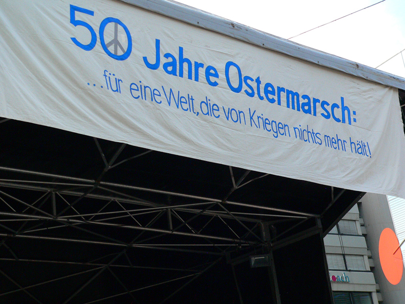 Zum 50. Ostermarsch trafen sich heute in Stuttgart auf dem Schlossplatz ca. 800 (laut Veranstalter) oder 500 (Schätzung der Polizei) um Ihre Forderungen z.B. Frieden schaffen, Soldaten raus aus Afghanistan oder gegen Atomkraft u.s.w.