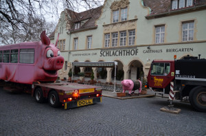 Die Säuli-Tramm hat Stuttgart erreicht und steht nun am SchweineMuseum in Gaisburg