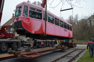 Die Säuli-Tramm hat Stuttgart erreicht und steht nun am SchweineMuseum in Gaisburg
