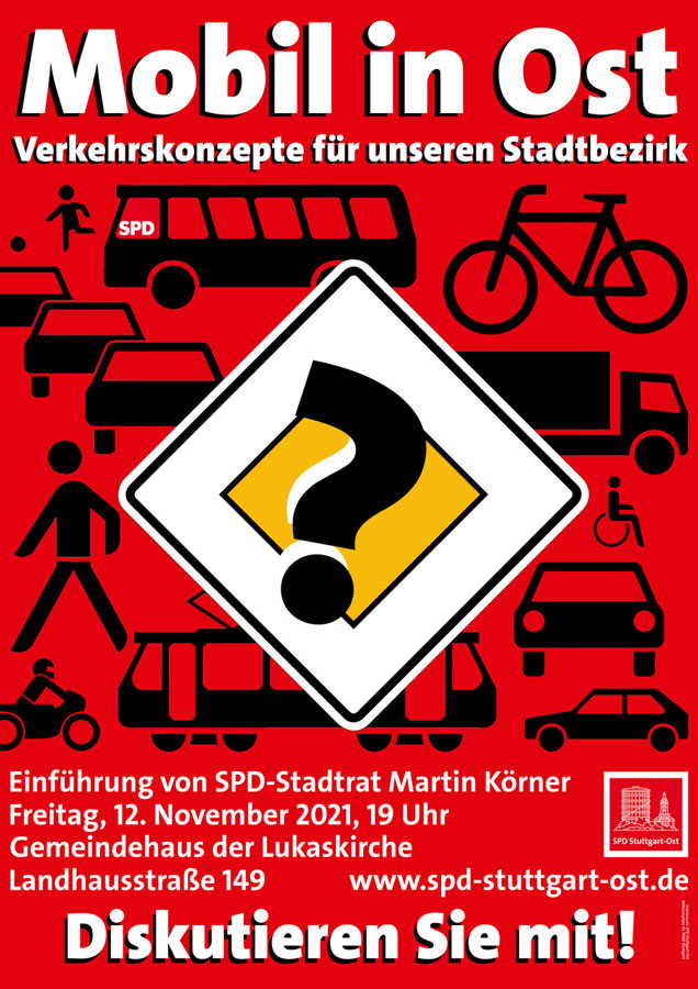 Der Straßenverkehr ist ein entscheidender Aspekt für die Attraktivität eines Stadtbezirks. Deshalb sucht die SPD in Stuttgart-Ost das Gespräch mit den Bürgerinnen und Bürgern. Am Freitag, 12. November, ab 19 Uhr im Gemeindehaus der Lukaskirche, Landhausstraße 149 heißt die Veranstaltung